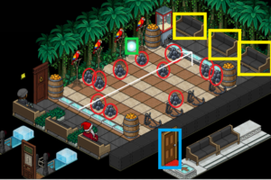 vous devez traversez le chemin dans le sens de la flèche en évitant les tas de boulets entourés en rouge, et la balle phosphorescente encadré en vert. Une fois que vous avez parcouru le chemin, assiez-vous sur l’un des sofa encadrés en jaune qui vous téléportera ensuite à coté du téléporte encadré en bleu.