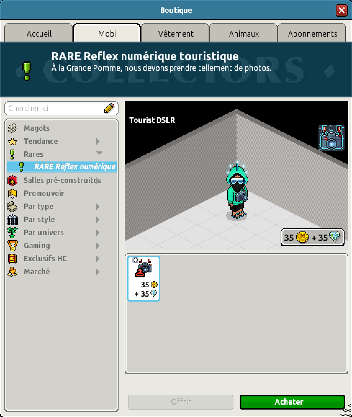 Côté catalogue ; nous avons pu observer la sortie du rare Reflex numérique touristique au prix de 35 crédits et 35 diamants ! Pour immortaliser vos souvenirs de vacances avant la rentrée