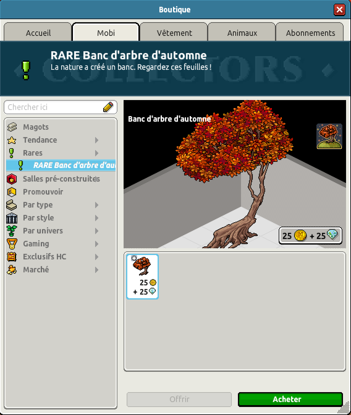 Nous avons la sortie du rare Banc d’arbre d’automne pour un montant de 25 crédits et 25 diamants