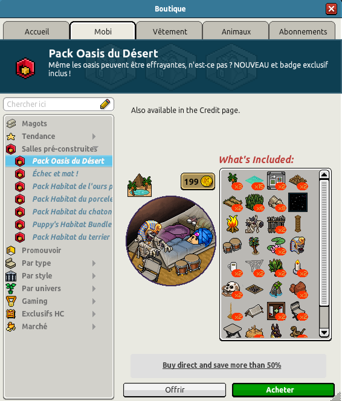 Un nouveau pack a aussi fait son apparition. Serez-vous capables d’affronter le désert d’Égypte version Habboween ! Wooooo ! Pack Oasis du Désert est disponible au prix de 199 crédits.