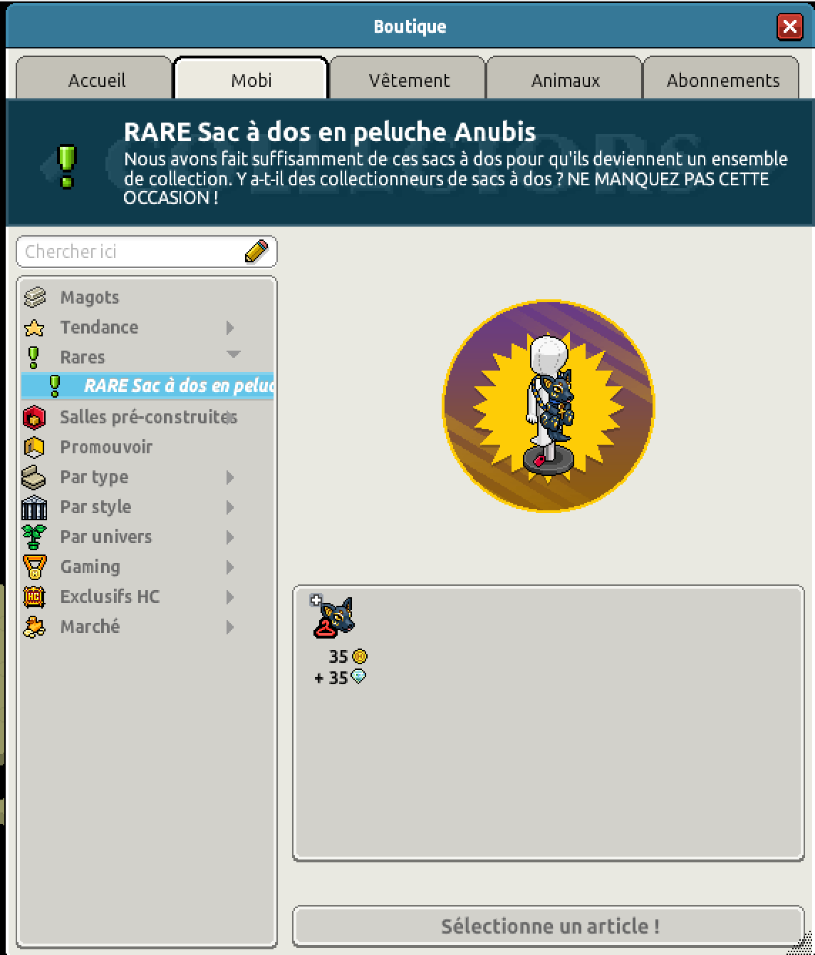 Côté catalogue ; nous avons pu observer la sortie du rare Sac à dos en peluche Anubis au prix de 35 crédits et 35 diamants ! Une divinité prête à transporter votre goûter.