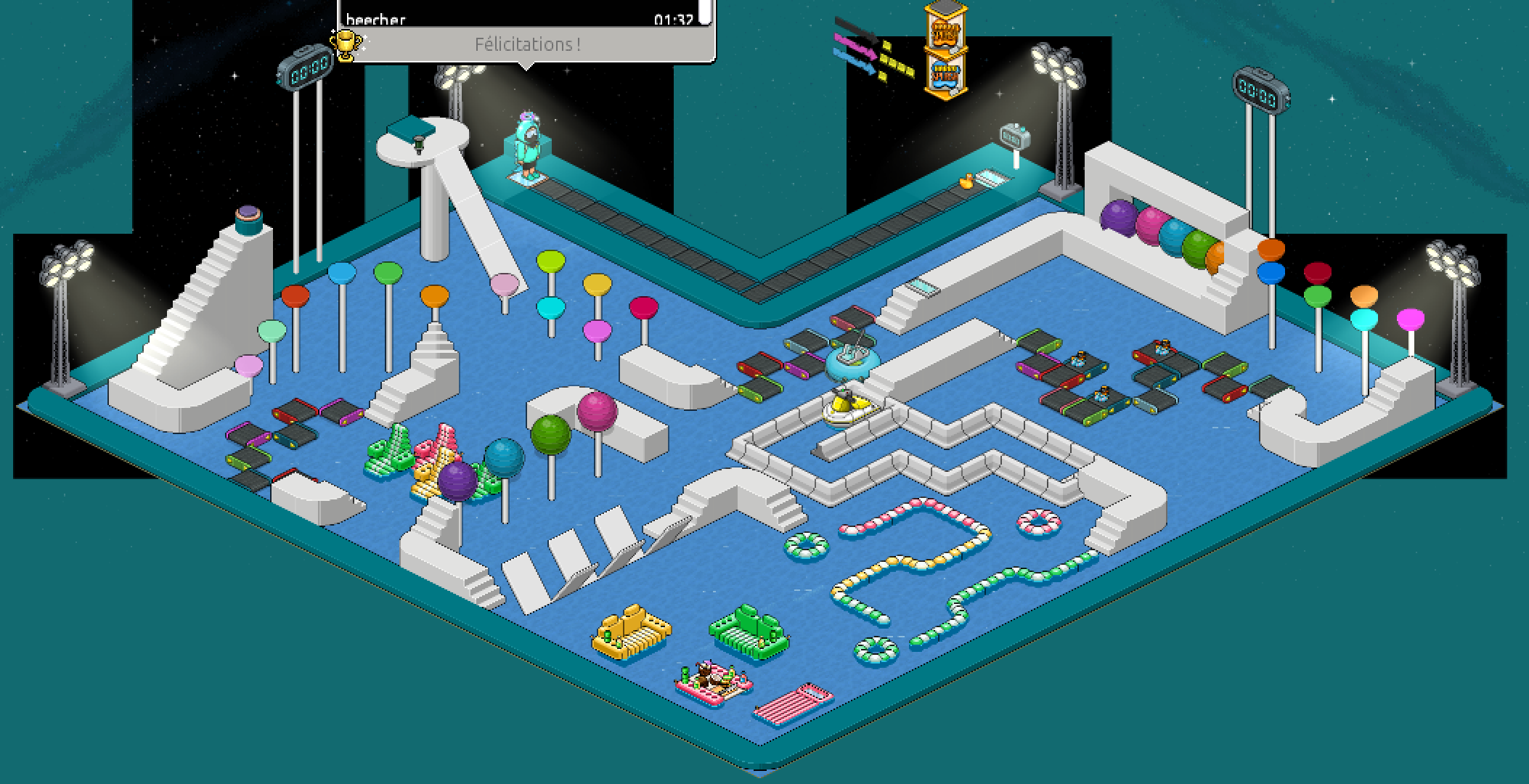 Côté jeux ; deux badges sont a remporter par le biais d’un parcours d’obstacles qui rappelle les vacances… Habbo Splash ! Ce jeu nous est proposé par Talin., Aquanaute, Lady.B, Outlander-, adrie31228 et Nicolas.