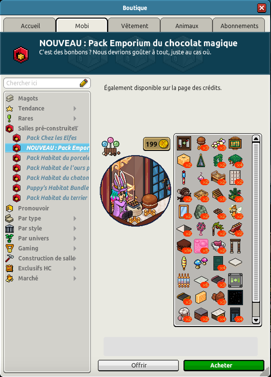 Nous avons la sortie du pack Emporium du chocolat magique pour un montant de 199 crédits