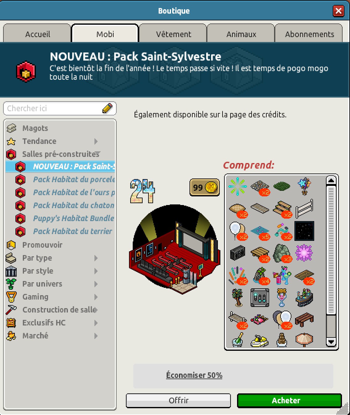 Un nouveau pack a fait son apparition. Le Pack Saint-Sylvèstre est disponible au prix de 99 crédits !