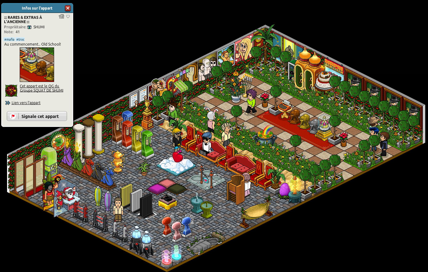 joueurs d’habbo.fr encore actif aujourd’hui qui nous replonge grâce à son appartement dans l’évolution des mobiliers du jeu. Nous y retrouvons des trônes « 2p » (220c/u), des trônes « Norman » (1100c/u), du hamac (500c), des « zonzon » (200c/u), de la machine à écrire (60 lingots), du pupitre à 40 lingots ou encore un beau trophée signé par Delph ancienne Community Manager d’Habbo.Fr pour ne citer qu’eux. Cet appartement a pour but de vous exposer les premiers rares et collectors de l’hôtel. Il ne s’agit bien évidemment pas d’un troc ; vous pourrez dans ce squat consulter les dates de sortie au catalogue de tous ces collectors et rares via les post-it ; un vrai travail de fourmi réalisé par ce joueur dévoué qu’est SHUMI.
