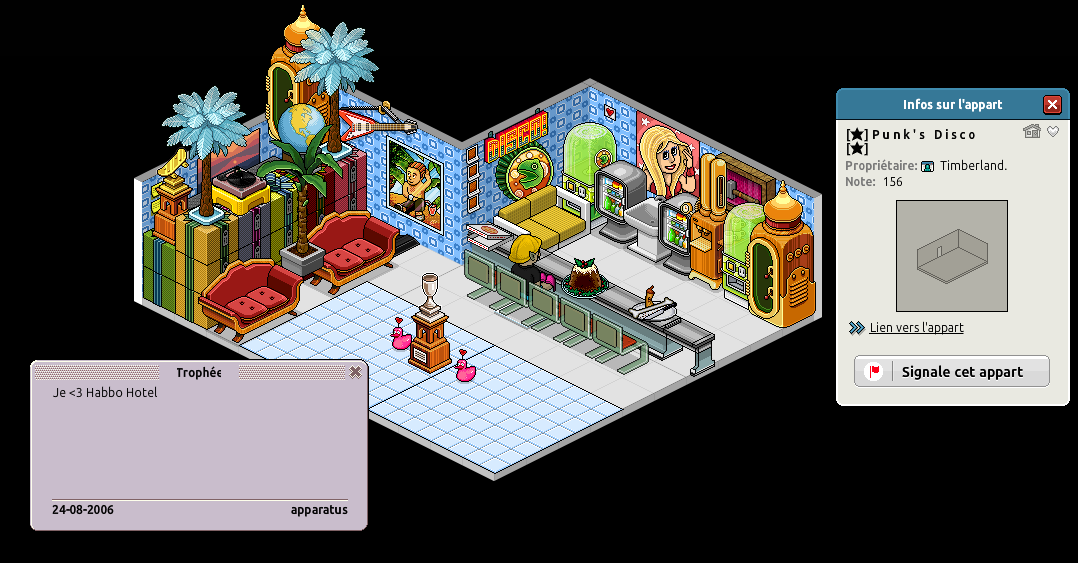 Aux premiers abords rien de bien exceptionnel dans cet appart si ce n’est ce trophée argent signé par l’un des deux premiers comptes créés sur Habbo.FR avec Whatwasit , j’ai nommé apparatus ! Il s’agit de l’unique