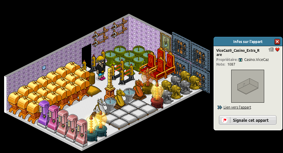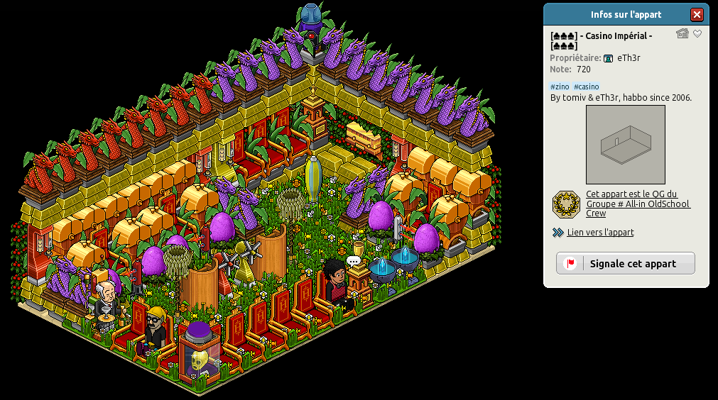 A l’heure où les casinos battaient leur plein (2006), le duo eTh3r et tomiv nous avaient sorti un bon petit casino oldschool des familles. Construction aérienne avec de la fusion lingots, ananas, dragons, « dodo » et dés magiques ; un classique architectural de cette époque. Cet appart contient également un trophée « null » signé par le célèbre staff Norman ainsi qu’un exceptionnel trophée infobus qui comme un bon vin se bonifie avec le temps. Comme en atteste le screenshoot, ce casino est désormais inactif comme son propriétaire qui ne s’est d’ailleurs pas reconnecté sur le jeu depuis 6 ans contre 3 ans pour son ami tomiv ayant fait une apparition éclaire lors du confinement en 2020 (covid-19). A la revoyure messieurs !