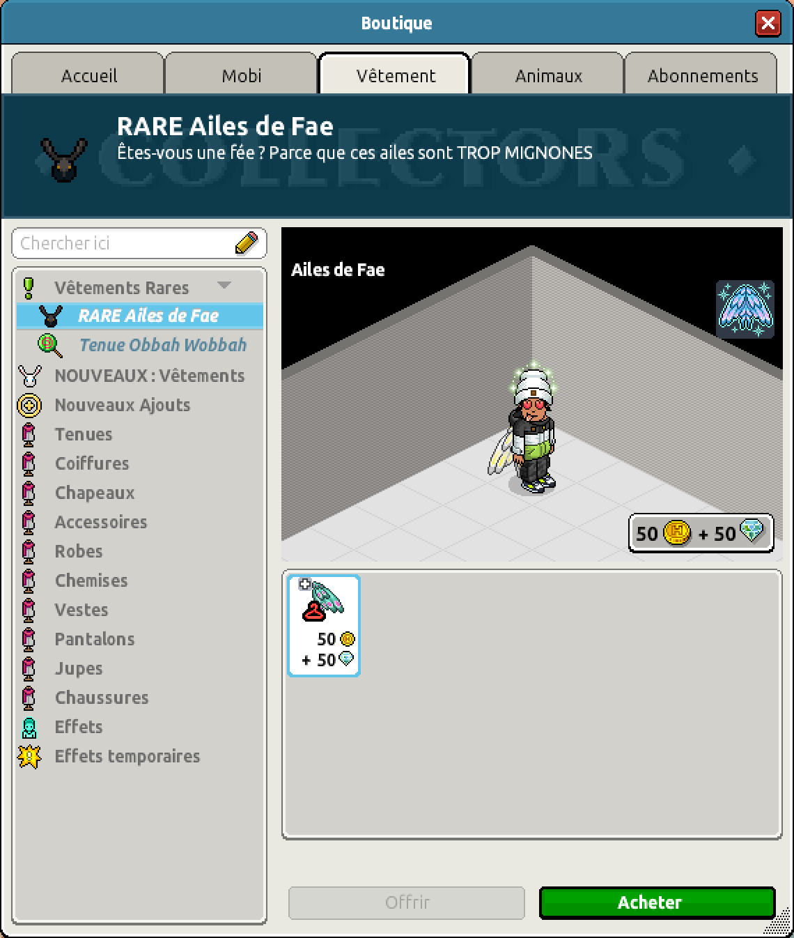 Nous avons pu observer la sortie du vêtement rare Ailes de Fae au prix de 50 crédits et 50 diamants.