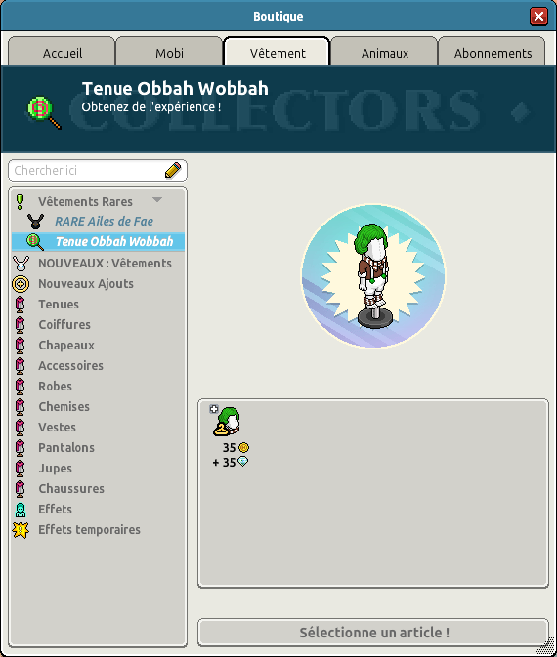 Côté catalogue ; nous avons pu observer la sortie du rare Tenue Obbah Wobbah au prix de 35 crédits et 35 diamants !