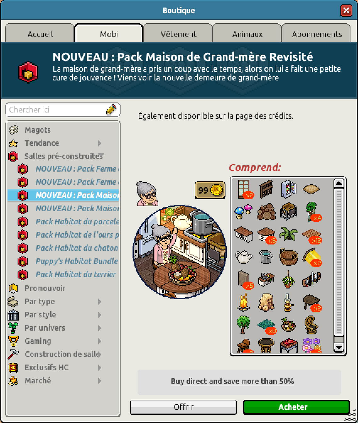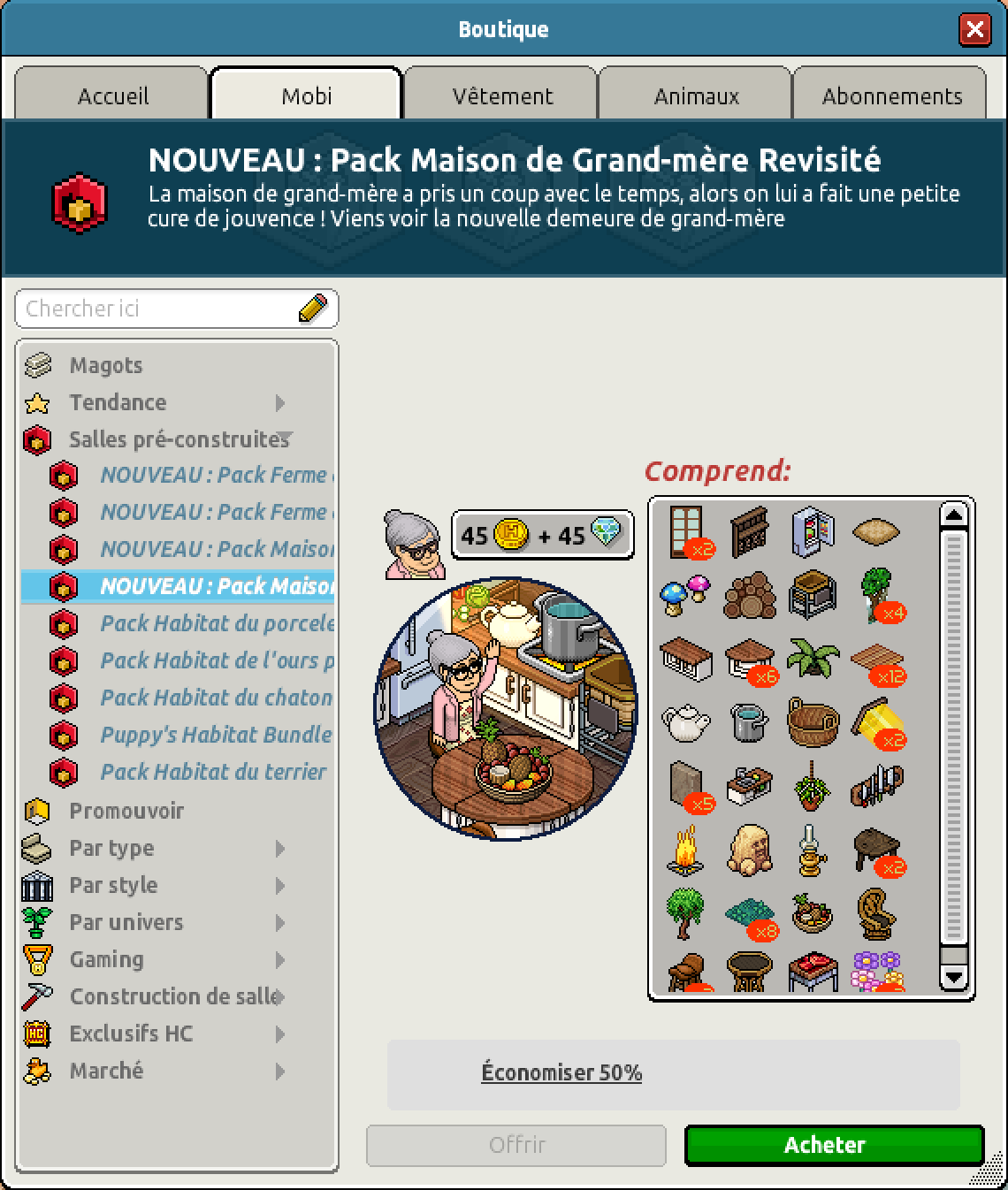 Deux nouveaux packs ont aussi fait leur apparition, tout d’abord le pack Maison de Grand-mère Revisité est disponible avec deux prix différents, 45 crédits et 45 diamants ou 99 crédits !