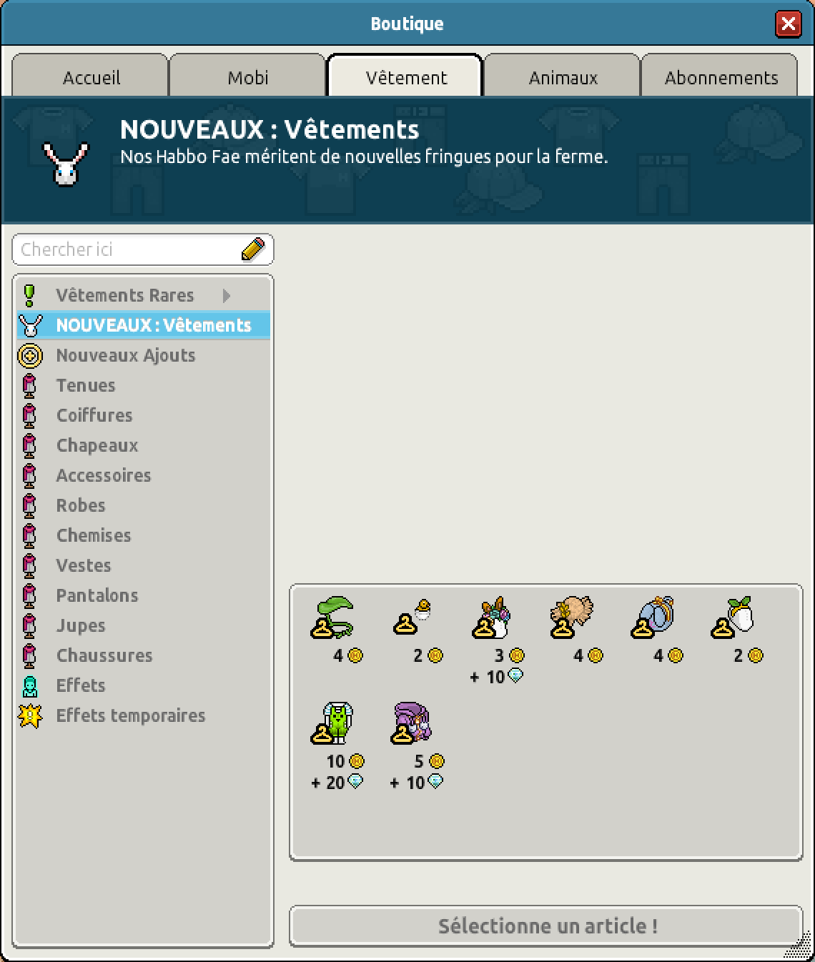 De nouveaux vêtements ont aussi fait leur apparition, vous pouvez les découvrir au catalogue pour un prix situé entre 2 crédits et 10 crédits et 20 diamants.