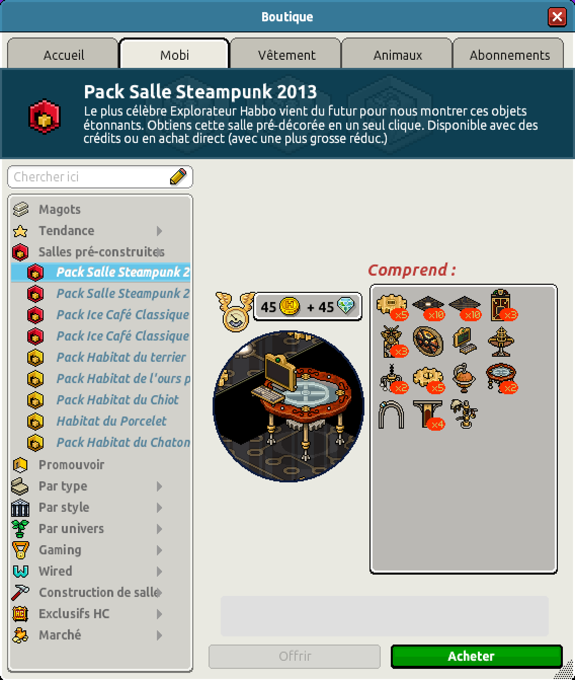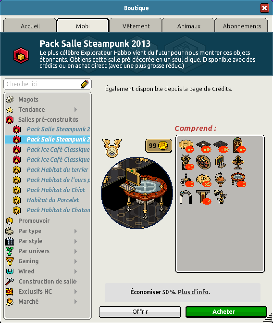 Un pack a aussi fait son apparition, le pack Salle Steampunk 2013 était disponible avec deux prix différents, 45 crédits et 45 diamants ou 99 crédits.