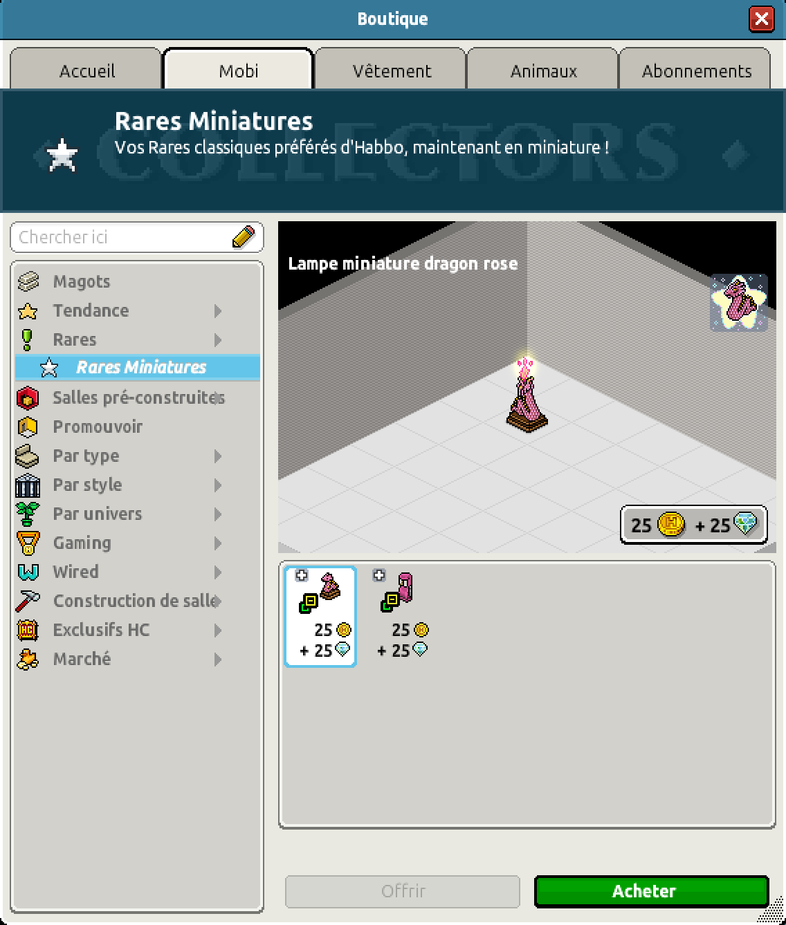 Côté catalogue ; nous avons pu observer la sortie du rare Lampe Miniature Dragon Rose au prix de 25 crédits et 25 diamants !