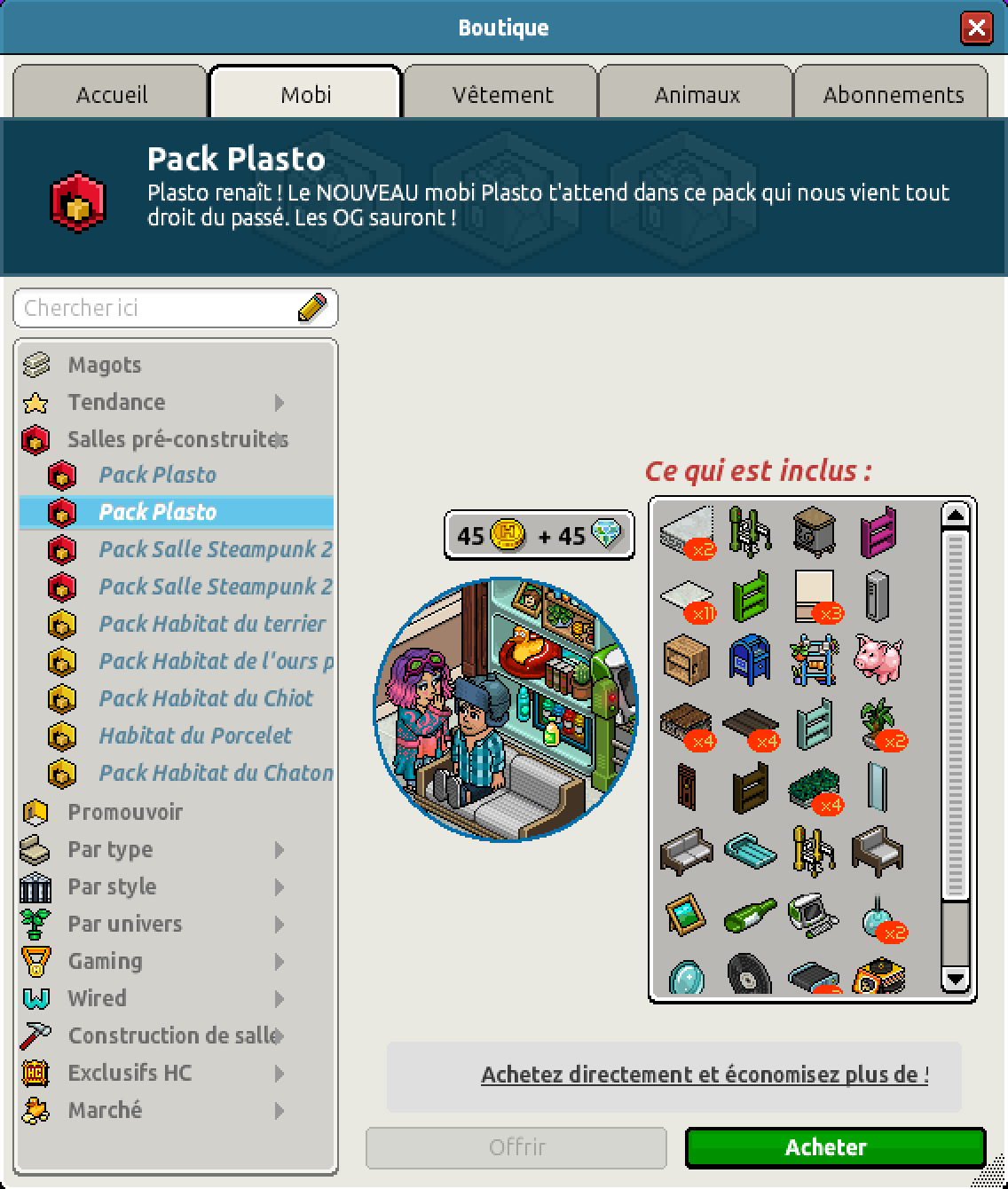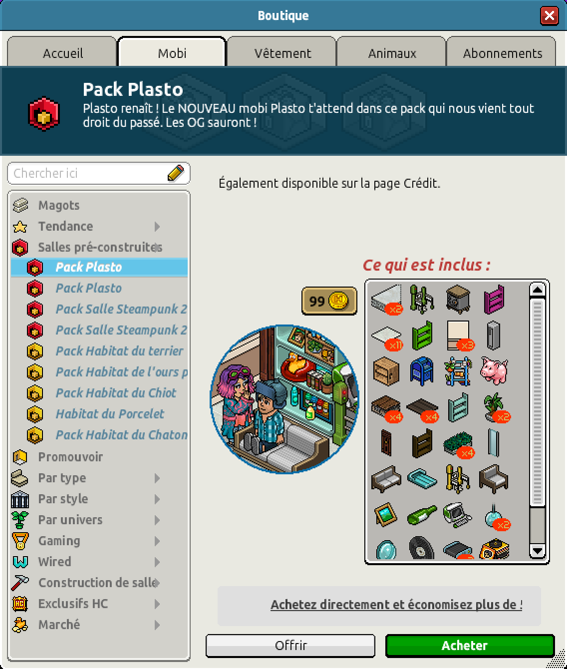 Un pack a aussi fait son apparition, le Pack Plasto était disponible avec deux prix différents, 45 crédits et 45 diamants ou 99 crédits.
