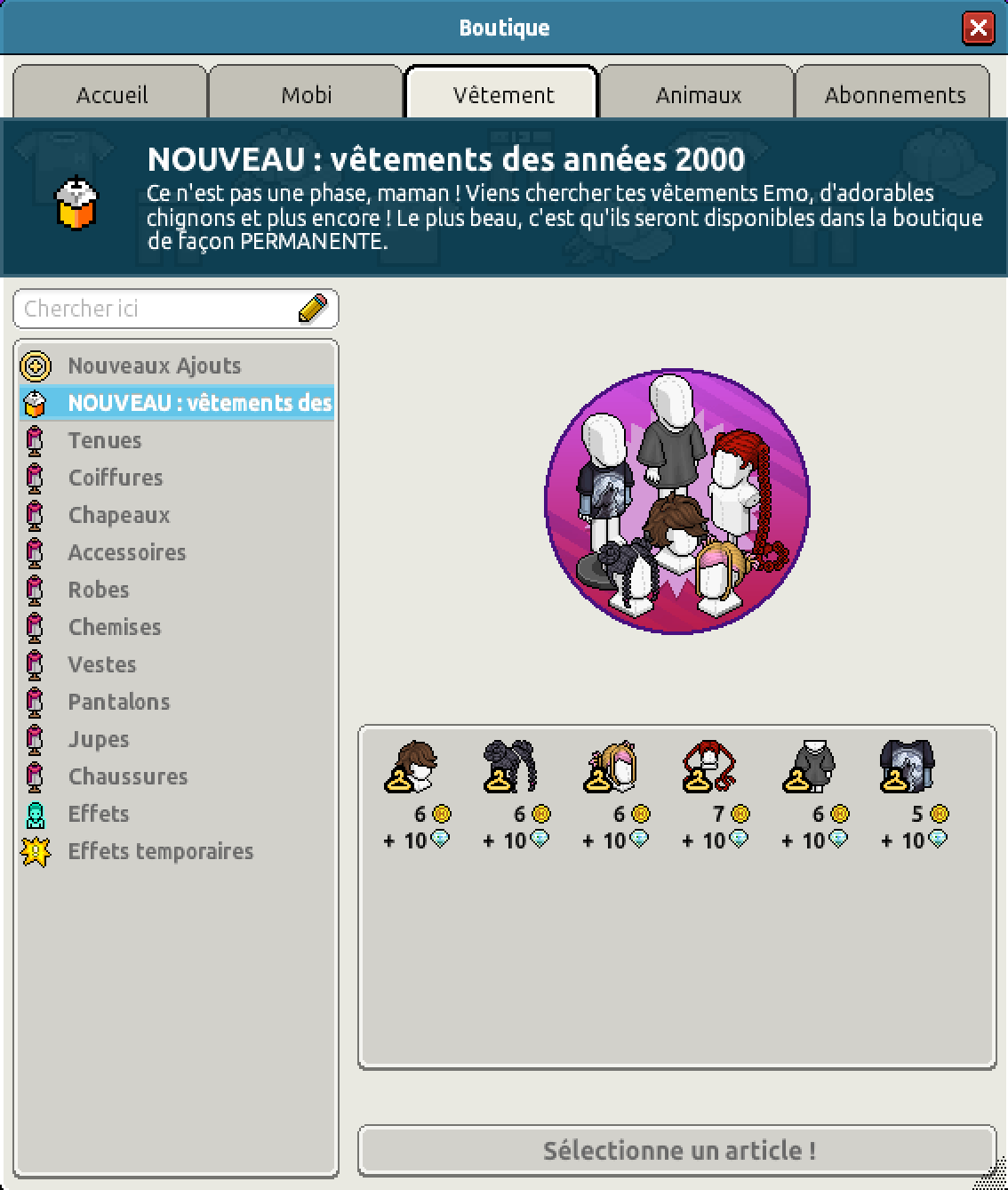 De nouveaux vêtements ont aussi fait leur apparition, il s’agit d’une gamme de vêtements baptisée Vêtements des années 2000.