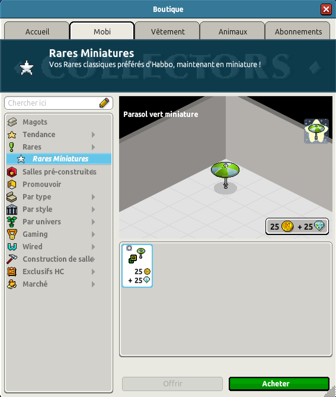Côté catalogue ; nous avons pu observer la sortie du rare Parasol Vert Miniature au prix de 25 crédits et 25 diamants !