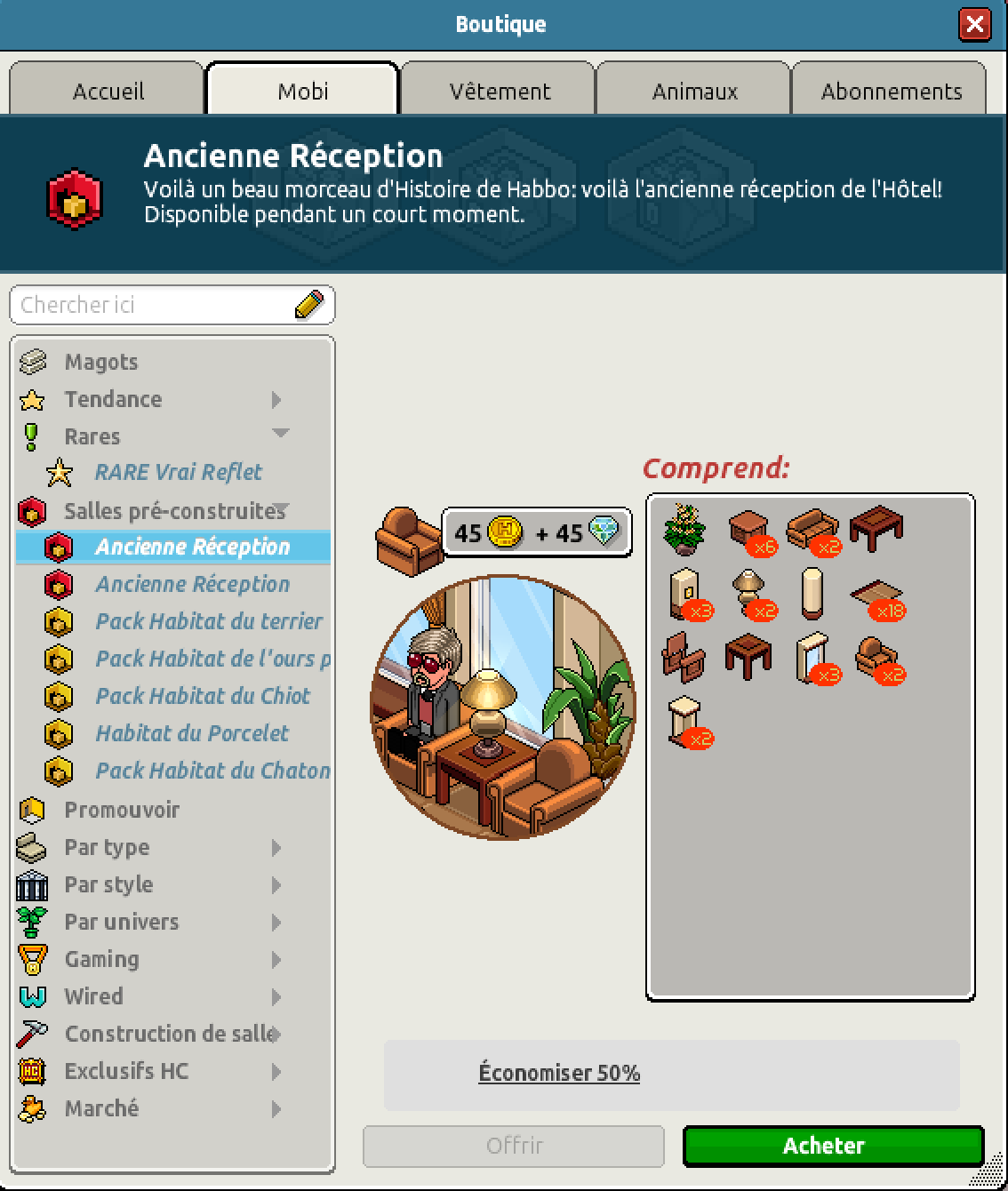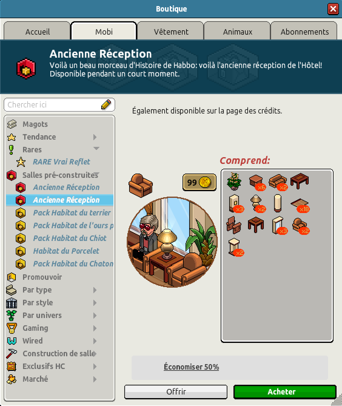 Nous avons la sortie du pack Ancienne Réception pour un montant de 99 crédits ou pour 45 crédits et 45 diamants