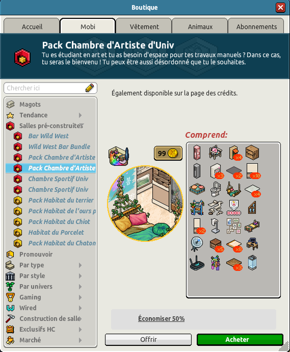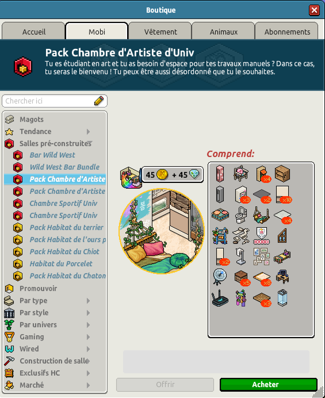 Nous avons également la sortie du pack Chambre d’Artiste d’Univ pour un montant de 99 crédits ou pour 45 crédits et 45 diamants