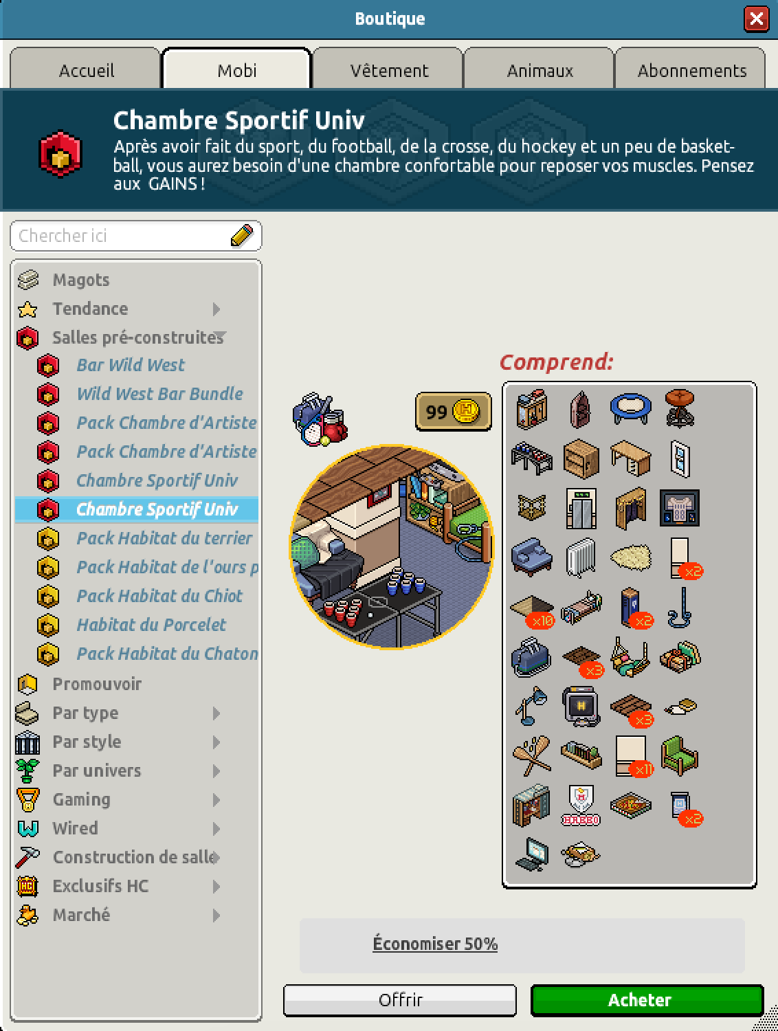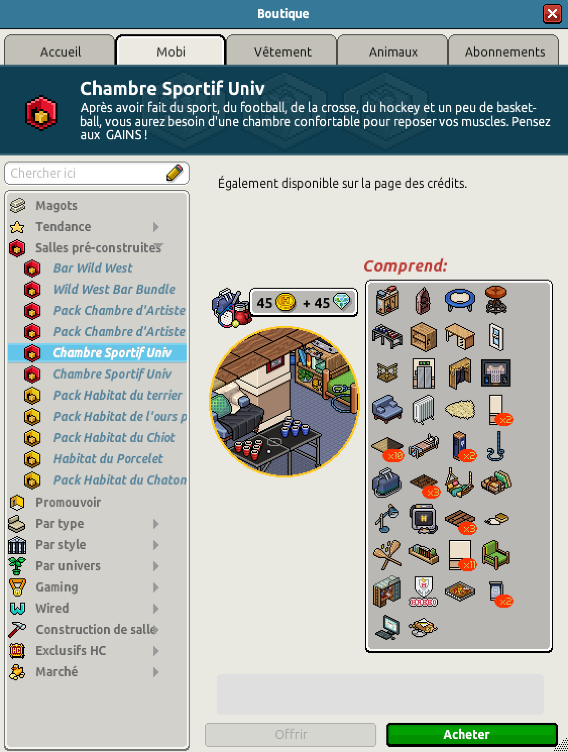 Nous avons la sortie du pack Chambre Sportif Univ pour un montant de 99 crédits ou pour 45 crédits et 45 diamants
