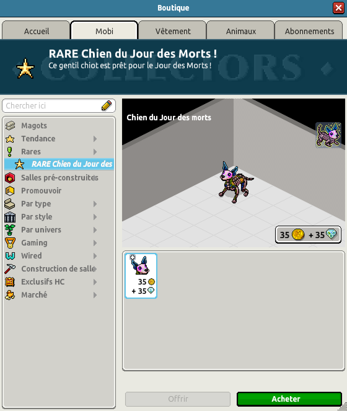 Nous avons la sortie du rare Chien du Jour des morts pour un montant de 45 crédits et 45 diamants