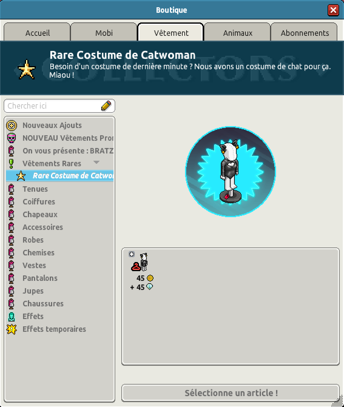 Côté catalogue ; nous avons pu observer la sortie du rare Costume de Catwoman au prix de 45 crédits et 45 diamants !