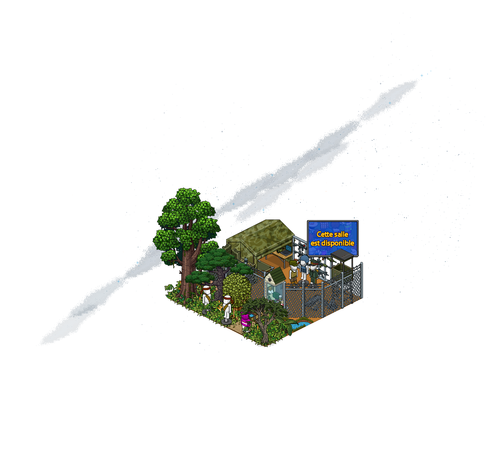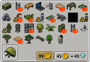 Mercredi, c’était le moment de se mettre au garde à vous ! Le Camp Militaire était obtenable dans la catégorie Salles préconstruites du catalogue, et au Habbo Shopping pour 5 Euros. Aperçu, contenu et badge ci-dessous ! Repos soldat !